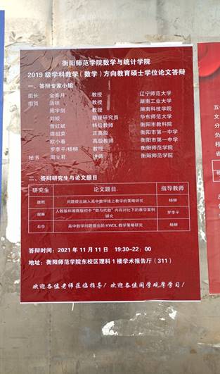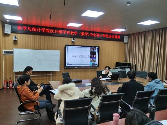 20211111日晚上七点半至十点,数学与统计学院在理科一楼311教室举行数学与统计学院2019级学科教学(数学)专业硕士学位论文答辩会,由于疫情影响本次答辩会线上举行。